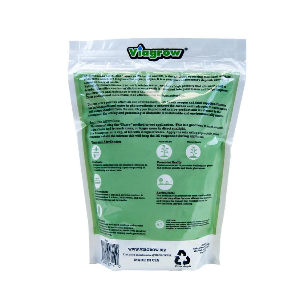 The Viagrow Food grade Diatomaceous earth has many uses in the garden, for your pets and in your home, which is why Viagrow diatomaceous earth is meticulously tested to assure the highest quality is being provided. Viagrow diatomaceous earth is mined from high qualit. Our diatomaceous earth has many uses including natural health supplement, stain remover, cleaning booster, natural deodorizer, DE can be applied directly to your pet’s coat to limit odors. It also works well in the bottom of your trash can to keep unwanted smells at bay 1 of our favorite uses for DE is its use in the garden, DE can be applied by sprinkling or dusting onto plants and into the soil. We also recommend using the Slurry method or wet application. This is a good way to reach the undersides of leaves, hard to reach areas or larger areas in direct sunlight. Application Instructions: Mix 8 tablespoons or 1/2 cup, of DE with 2 cups of water. Apply the mix using a spray bottle, please remember to shake the mixture this will keep the DE suspended during application. DE can be used on all flower, shrubs, herbs, fruits and vegetables. Reapply DE after it rains. Whether you’re cleaning an oil spill up, removing a stain or increasing the health of your garden the Viagrow Food grade DE is a product you will always want to have on hand.