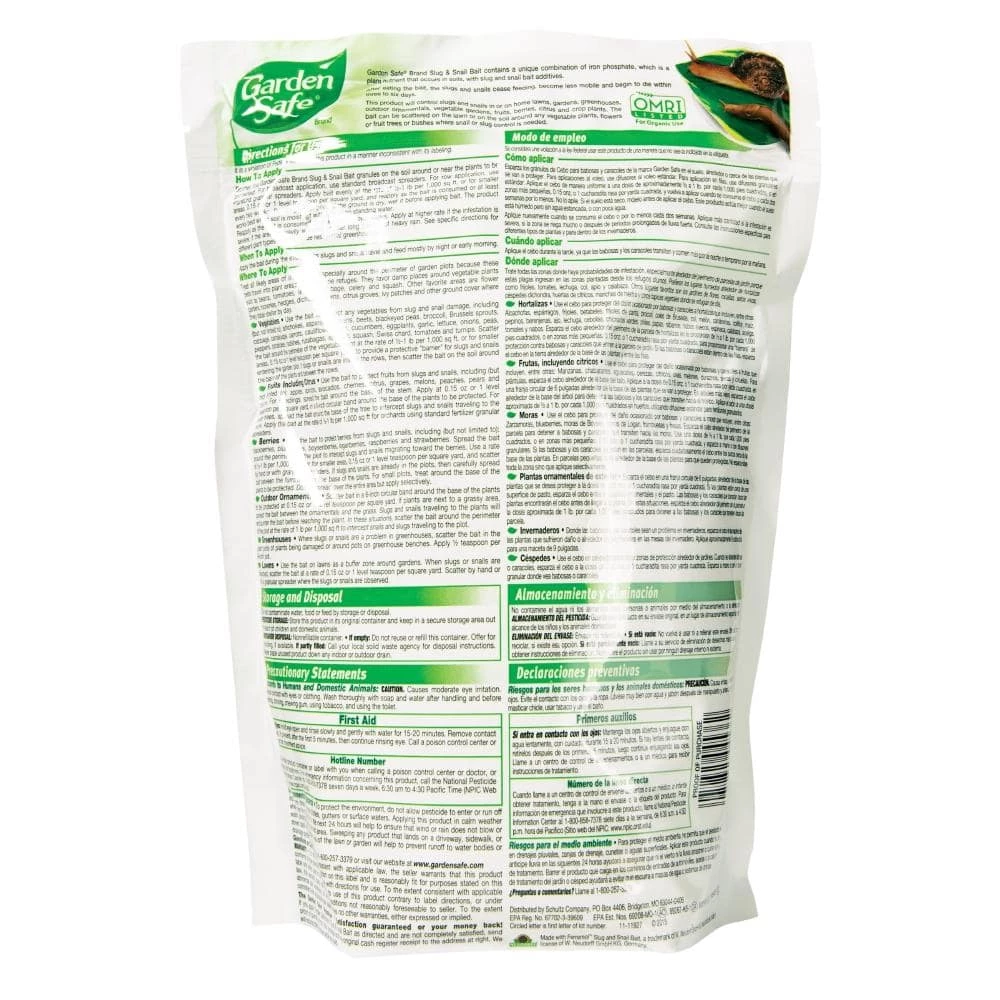 The experts behind Garden Safe brand know home gardening is as much about how you grow as what you grow. Since 2002, Garden Safe brand has delivered garden products including natural-based and botanically derived formulas to growers who prefer to control plant pests and diseases without traditional chemicals. Organic gardeners trust our solutions to keep garden pest control simple – and let nature do the rest. Let goodness grow.Garden Safe Brand Slug & Snail Bait granules contain a unique combination of iron phosphate, which is a plant nutrient that occurs in soils, with slug and snail bait additives. After eating the bait, slugs and snails cease feeding, become less mobile and begin to die within 3 to 6 days. This product will control slugs and snails in or on home lawns, gardens, greenhouses, outdoor ornamentals, vegetable gardens, fruits, berries, citrus and crop plants. The bait can be scattered on the lawn or on the soil around any vegetable plants, flowers or fruit trees or bushes where snail or slug control is needed. This product can be used around pets and wildlife. OMRI (Organic Materials Review Institute) Listed.Apply the bait during the evening, as slugs and snails travel and feed mostly by night or early morning. Treat all likely areas of infestation, especially around the perimeter of garden plots.
