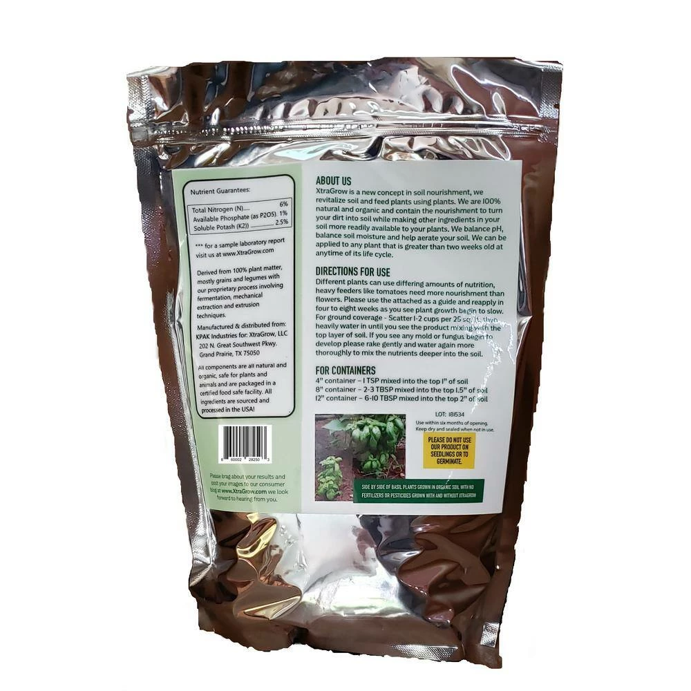 XtraGrow Plant Food and Soil Nourishment is a 6 – 1 – 2.5 premium 100% Organic fertilizer that also helps aerate soil, helps balance pH, helps stabilize moisture, reduces evaporation, provides pest resistance and has pre-emergant weed suppression properties. XtraGrow is a new concept that uses only plants to feed plants. Our chemical free processing uses only legumes, grains and other plant matter to provide a super density of nutrition that is both immediately available and lasts over a few months. XtraGrow does not contain any manure, no industrial wastes and no heavy metals.