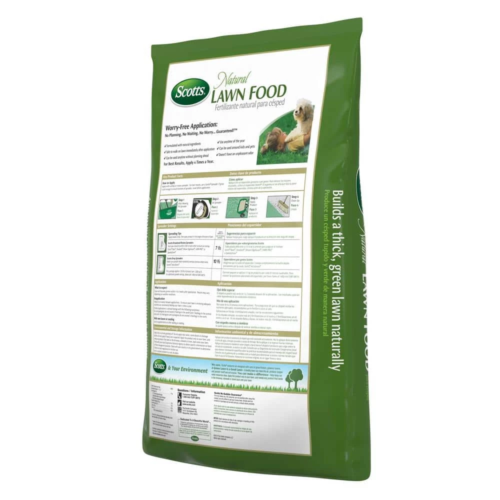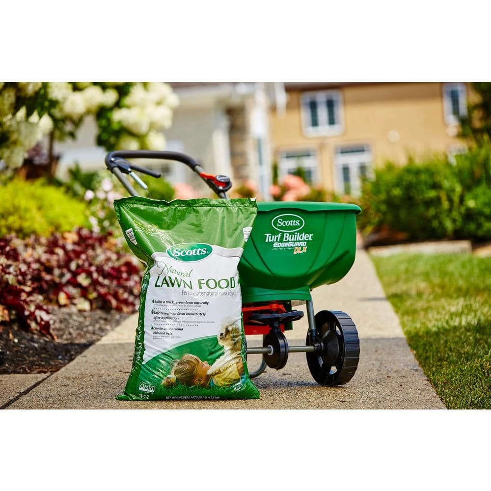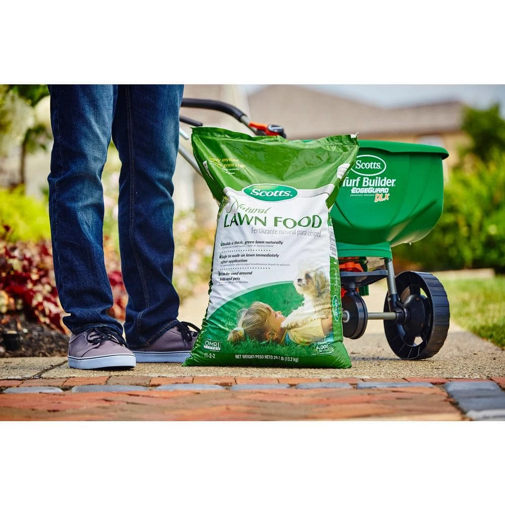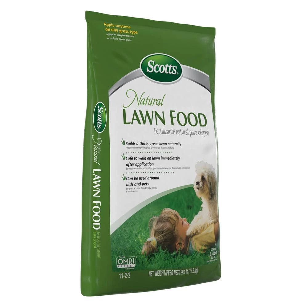 The Scotts 29 lbs. Dry Natural Lawn Food helps build a thick, green lawn and works on a variety of grasses. The lawn food is a slow-release formula that continues to work for up to 8-weeks for long-lasting applications and features an 11-2-2 N-P-K ratio to provide the nutrients that lawns need to flourish. The 29 lbs. bag provides coverage for up to 4,000 sq. ft.