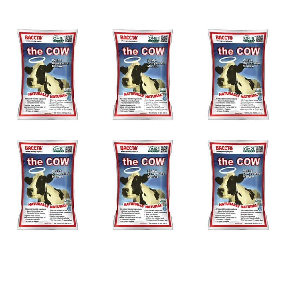 Add important nutrients to your lawn or garden with the Michigan Peat Baccto 1640 Wholly Cow Compost and Manure. Each of the 6, 40-qt. bags of organic compost weigh 38 pounds. The compost has been screened for uniform consistency. Made of natural animal manure and composted peat, Wholly Cow has a high nutrient content that is ideal for a wide range of plants, from flowers to shrubs to vegetables. The compost has a natural water holding capacity, giving you more time in between waterings and improving root health. Use the Wholly Cow Compost and Manure for nursery plantings, as a top-dressing for new or established lawns, or laying sod. You can also add this compost to flower and vegetable garden beds to improve growth and enjoy strong, healthy plants. Unlike other manure composts, the Wholly Cow Compost and Manure features an odor-free formula. With its natural ingredients and odor-free formula, the Michigan Peat Baccto Wholly Cow Compost and Manure is an easy way to add important nutrients to your garden.