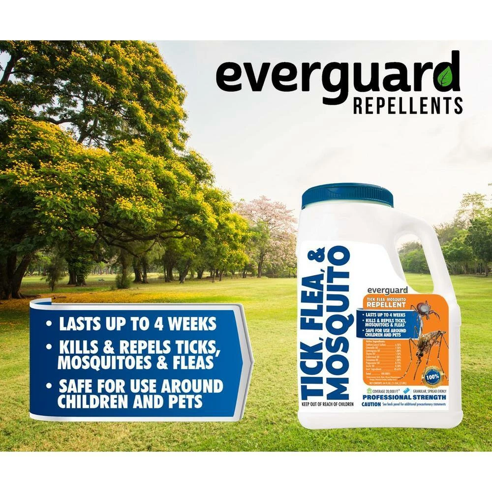 Everguard Repellent formulas are commercially developed and safe to use around children and pets. Best of all, our non-offensive odor. Everguard Tick and Mosquito 5 lbs. Granular Repellent product is proven effective and will not wash off in rain or irrigation.