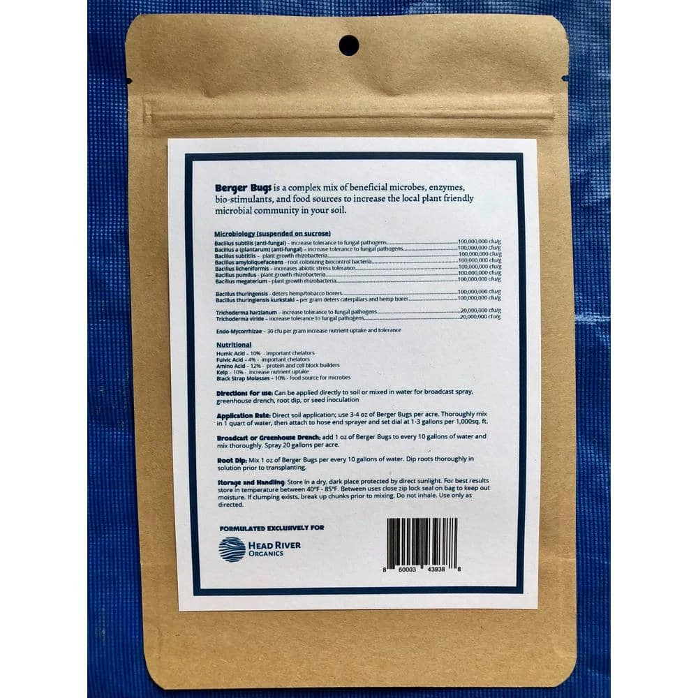 Berger Bugs is a complex mix of beneficial microbes, enzymes, bio-stimulants, and food sources to increase the local plant friendly microbial community in your garden. Microbiology(suspended on sucrose): 7 Bacillus strains – 100,000,000 cfu/gm/each total 700,000,000 2 BT strains – 100,000,000 cfu/gm/each total 200,000,000 2 Trichoderma strains-20,000,000 cfu/gm/each total 40,000,000 Endo-Mycorrhizae – 30 cfu/gm Nutritional: Humic Acid – 10% Fulvic Acid – 4% Amino Acid – 12% Kelp – 10% Black Strap Molasses – 10%. Can be applied directly to soil or mixed in water for broadcast spray, greenhouse drench, root dip, or seed inoculation. Application Rate: Direct soil application-use 3 oz. to 4 oz. of Berger Bugs per acre. Thoroughly mix in 1 qt. of water, then attach to hose end sprayer and set dial at 1 Gal. per 1,000 sq. ft. Broadcast or Greenhouse Drench-add 1 oz of Berger Bugs to every 10 Gal. of water and mix thoroughly. Spray 20 Gal. per acre. Root Dip-Mix 1 oz of Berger Bugs per every 10 Gal. of water. Dip roots thoroughly in solution prior to transplanting.