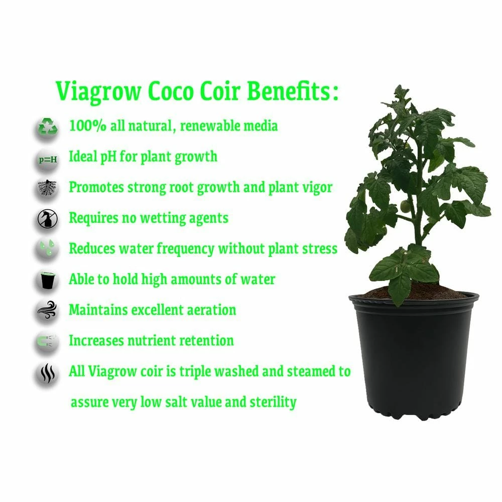 Viagrow Coco Coir 50 l with Micro Charge is an explosive blend bringing you and your plants a premium growing substrate, ready to use completely natural, renewable plant growing media made from coconut husk and coconut fiber with Micro Charge a multi-strain Bacillus blend targeting plant health and growth promotion. Viagrow coir is triple washed and sterilized to meet exacting standards and guarantee a low salt content. Viagrow Coco is excellent as a stand-alone plant growth media or can be used in conjunction with your favorite soil, peat based media, perlite or vermiculite. Viagrow coco has an optimal water to air ratio, is disease and pathogen free, is free of odor, chemical additives, has an ideal pH and is well suited for all types of plant production and when combined with The Micro Charge assures that your plants will reach their maximum potential. Each 50g pack of Micro Charge treats 2.5 cu. ft. of soil/planting substrate or compost material. Micro Charge contains 4 Billion CFU/g, 50g pack of Micro Charge treats 2.5 cu. ft. of soil/planting substrate or compost material. Made of ready-to-use fluffed coconut pith fiber and comes with Micro Charge Flushed of excess sodium Can be used in conjunction with your favorite soil, peat based media, perlite or vermiculite Disease and pathogen free Free of chemical additives Ideal pH and is well suited for all types of plant production Optimum air to water ratio.