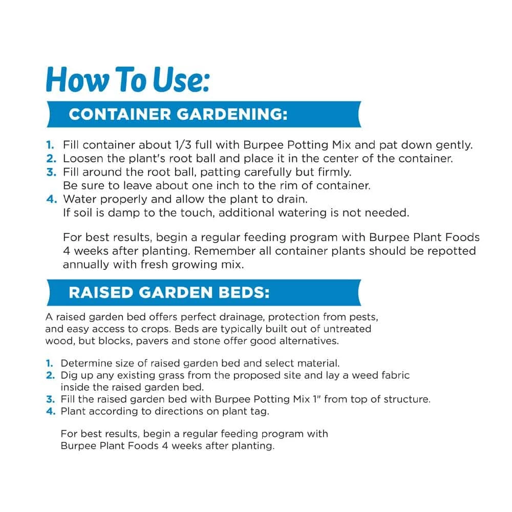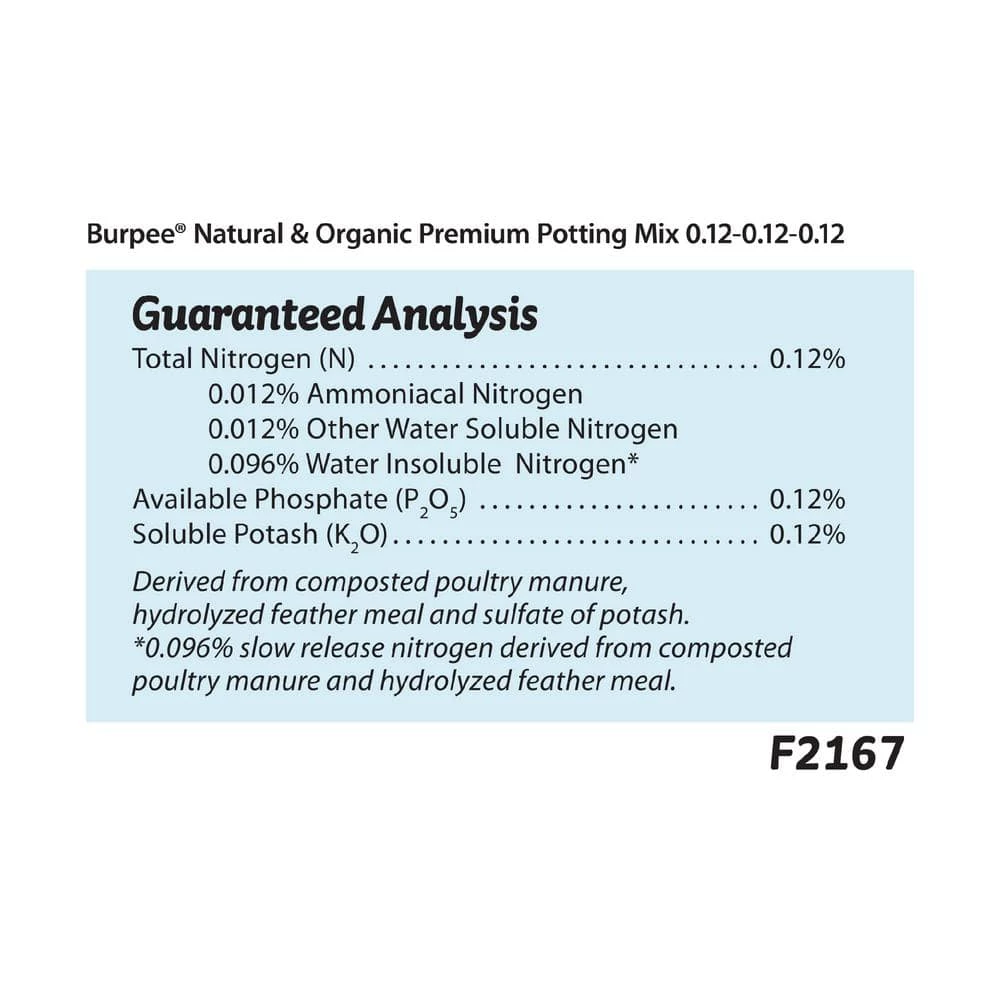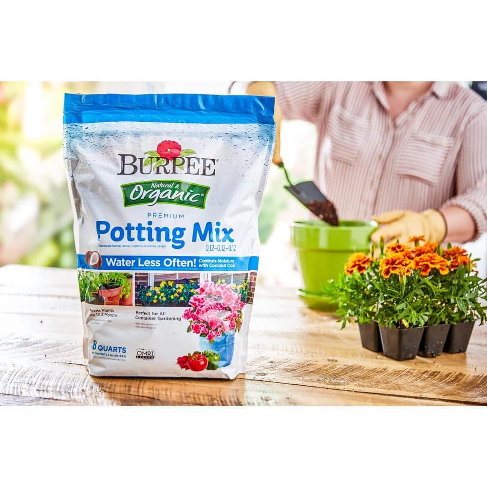 Burpee Natural & Organic Premium Potting Mix is enriched with Burpee plant food for vibrant flowers and delicious vegetables and herbs. Formulated with coconut coir, a sustainable and renewable resource, that helps maintain moisture between waterings for vibrant flowers and delicious vegetables and herbs. Perfect for container and raised gardens.
