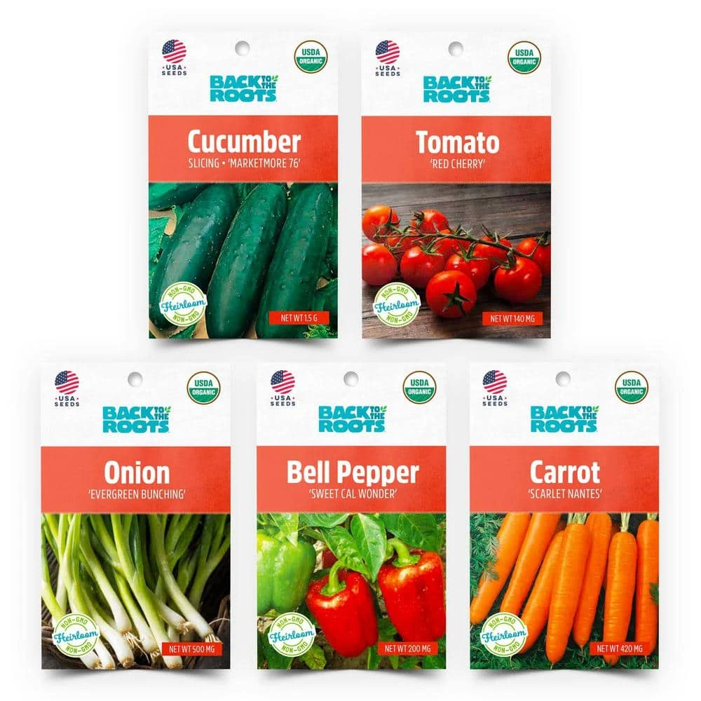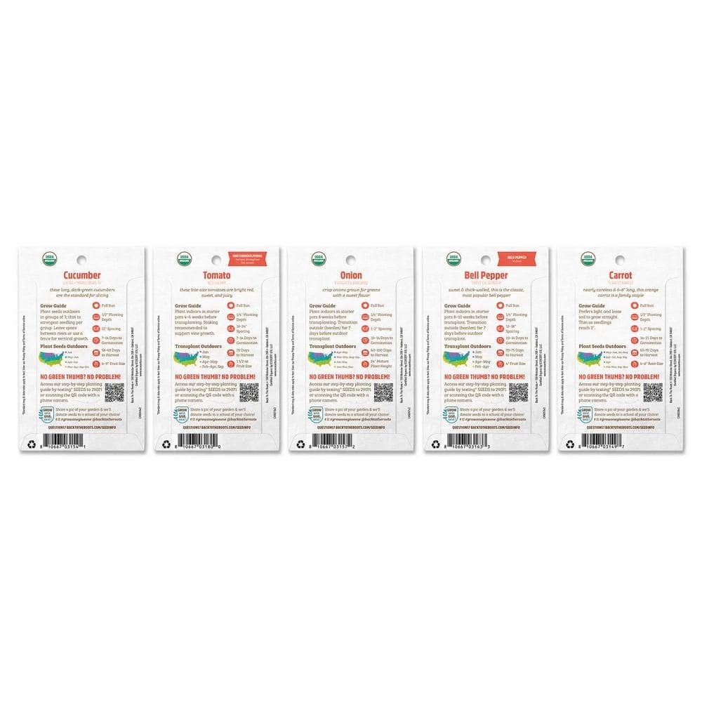 - All the seeds you can plant: this pack includes Cucumber (Marketmore 76), Tomato (Red Cherry), Onion (Evergreen Bunching), Bell Pepper (Sweet Cal Wonder), and Carrot (Scarlet Nantes)
