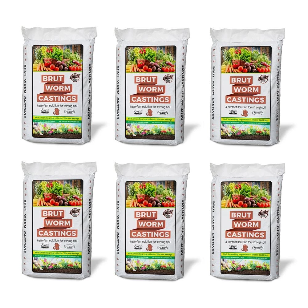 Your plants will thrive with this 6-pack of the Brut Worm Farms Premium Worm Castings Soil Builder, Non-toxic and odor-free, this soil builder is suited for indoors or outdoors and is an excellent choice houseplants, vegetables, shrubs and more. Designed for truly natural gardening, earthworm castings are dark. rich, pure and high in beneficial microbes, bacteria and organic matter, providing long-term nourishment to your plants’ soil. The nutrient- and mineral-dense worm castings include enzymes and bacterium to keep your soil fertile and deliver essential nutrients such as Magnesium, Potassium, Iron, Calcium, Sulfide, Nitrogen and Phosphorous directly to the roots of your plants, helping them flourish. This garden soil is perfect as a seed starting mix for new plants and lawns or for a fertilizer-like boost to your existing landscape or flower bed. The worms are fed purely natural organic feed and raised indoors in containers, enabling pure, consistent, high-quality castings that your plants will love. Keeping plants happy and healthy is easier than ever with this 6-pack of the 30 lbs. bag of Brut Worm Farms Worm Castings. You’ll have plenty of nutrients to keep your garden thriving season after season.