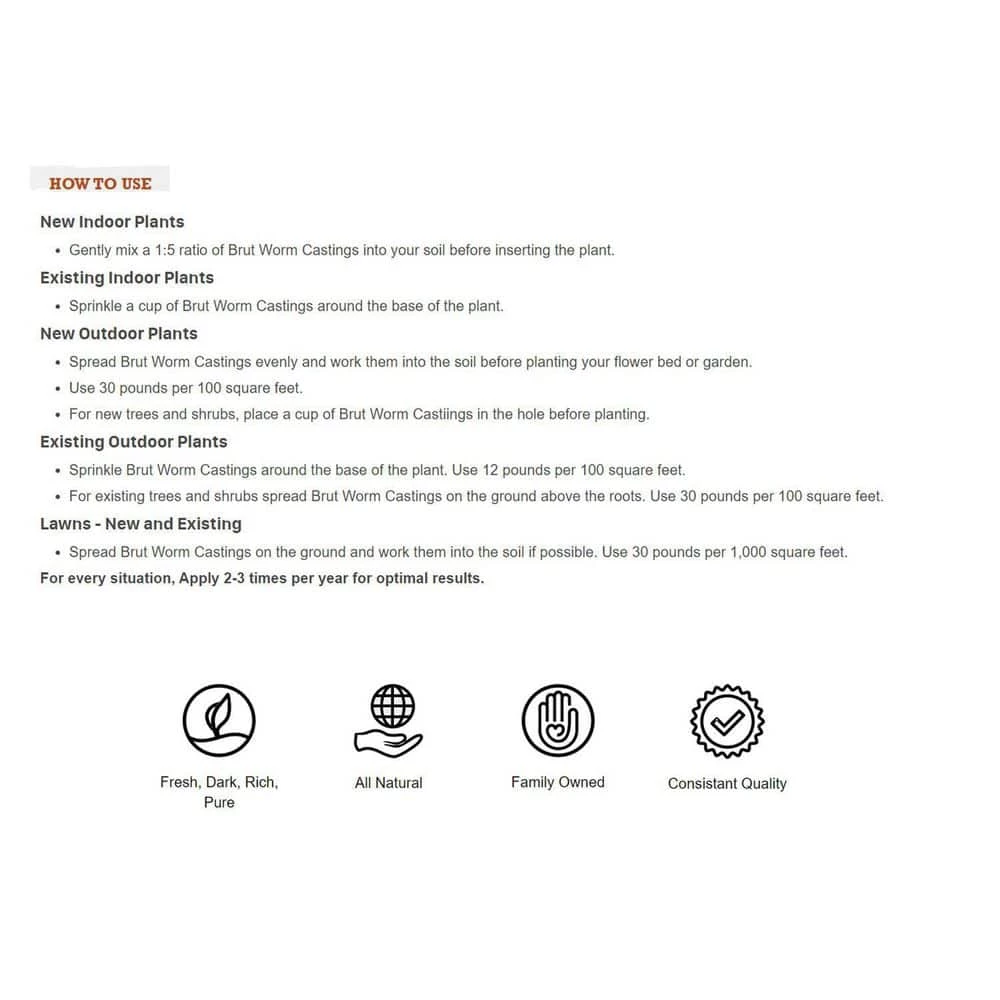 Your plants will thrive with this 2-pack of the Brut Worm Farms Premium Worm Castings Soil Builder! Non-toxic and odor-free, this soil builder is suited for indoors or outdoors and is an excellent choice houseplants, vegetables, shrubs, and more.Designed for truly natural gardening, earthworm castings are dark, rich, pure, providing long-term nourishment to your plant’s soil. The nutrient- and mineral-dense worm castings to keep your soil fertile and deliver essential nutrients such as Magnesium, Potassium, Iron, Calcium, Sulfide, Nitrogen, and Phosphorous directly to the roots of your plants, helping them flourish. This garden soil is perfect as a seed starting mix for new plants and lawns, or for a boost to your existing landscape or flower bed. The worms are fed purely natural organic feed and raised indoors in containers, enabling pure, consistent, high-quality castings that your plants will love.Keeping plants happy and healthy is easier than ever with this 2-pack of the 30-Pound bag of Brut Worm Farms Worm Castings. You’ll have plenty of nutrients to keep your garden thriving season after season!