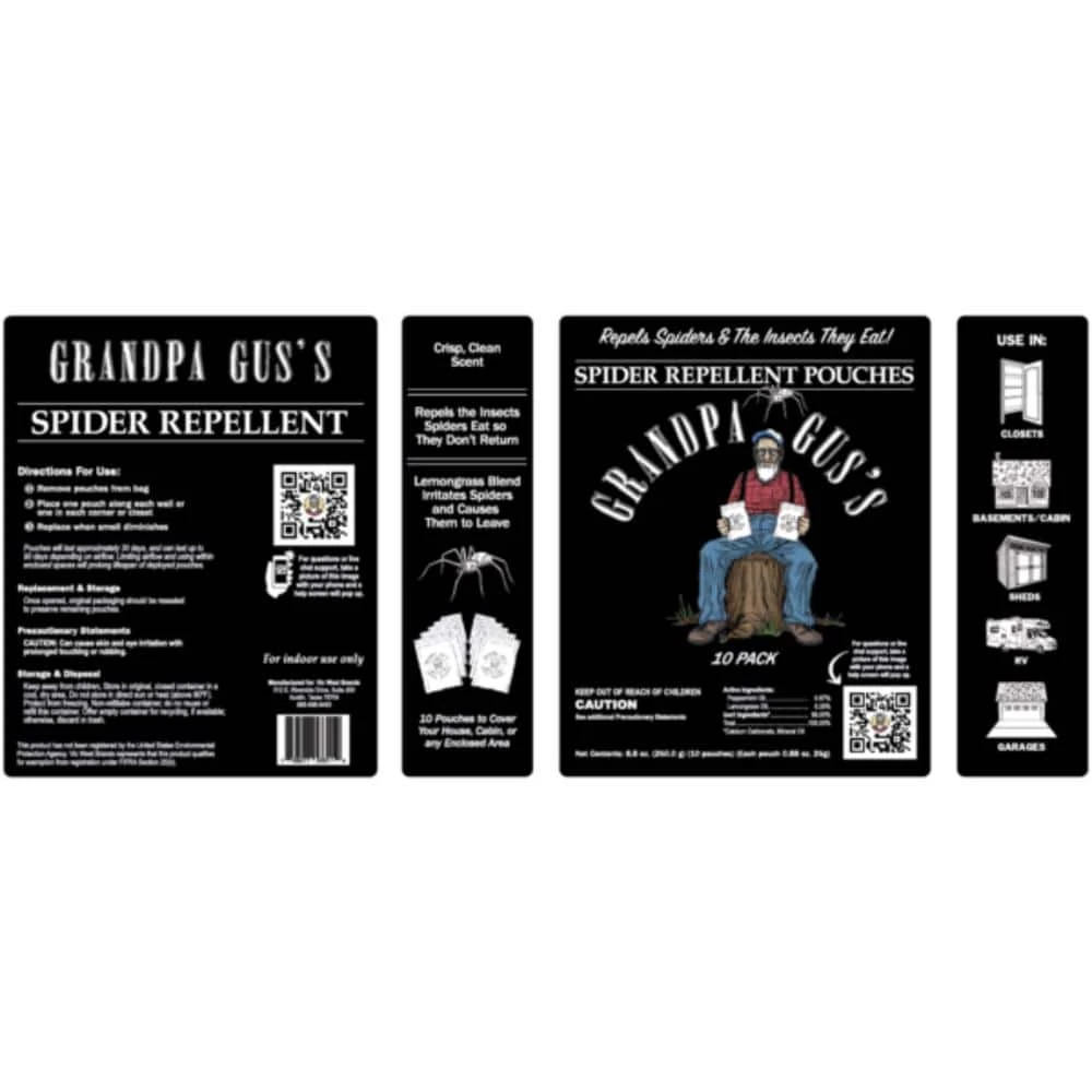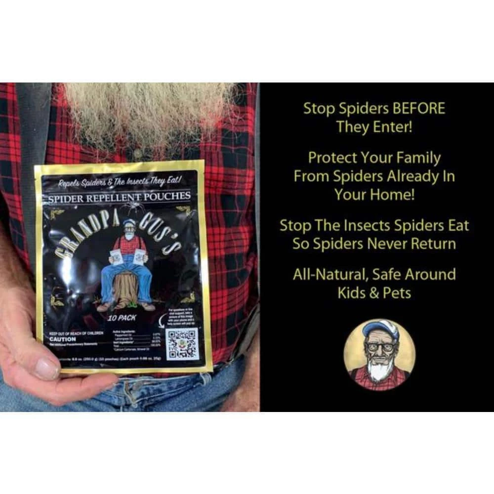 Stop Spiders before they enter your bed, closet or home. Grandpa Gus’s Spider Repellent Pouches contain all-natural ingredients, which include Peppermint Oil, Lemongrass Oil and Calcium Carbonate. To use, simply place a pouch where you’ve seen spiders, their webs or the bugs they eat. Each-package contains 10 pouches, which is enough for 1 home cabin or RV.